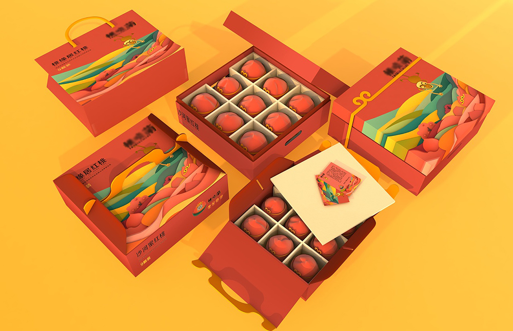 設計理念:此款水蜜桃水果包裝為12枚裝,包裝結構選擇飛機盒盒形,在再配上提手,方便運輸、方便攜帶;在封面設計上運用了留白的處理手法形成虛實、疏密的對比,來達到包裝精簡、干練且不失細節和亮點的效果,在風格上更為簡潔和典雅,重點是將產品與公司品牌名稱融合在一起,從而使得該公司的產品能作為一種臻品敬贈給知音及智者。