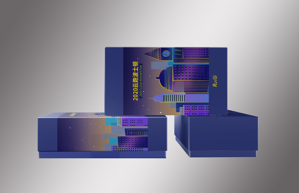 設計理念:本款包裝主要是推廣、宣傳一場“云跑”活動品牌,整個包裝盒以充滿希望的藍色為主打色,正面采用手繪波士頓建筑物圖案作為主圖,通過圖案可以展示出本次活動的主題,讓參與者看到本款包裝盒一目了然。