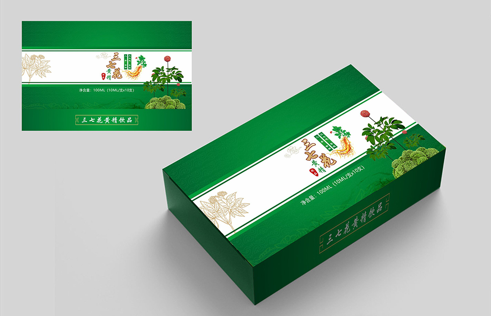 設計理念:本款包裝主要是打造一款“三七花黃精飲品”的保健產品品牌,包裝盒經過重新設計之后,無論是從版式結構上,還是色彩搭配上都融合了產品的品牌形象。整個包裝盒以綠色為主色調,正面以三七花、黃精、人參、雪蓮等原材料圖片作為宣傳實物圖,創意文字與圖片進行結合,最終進行規范和統一,這些內容信息都是以保健行業發展的角度進行考慮到的。